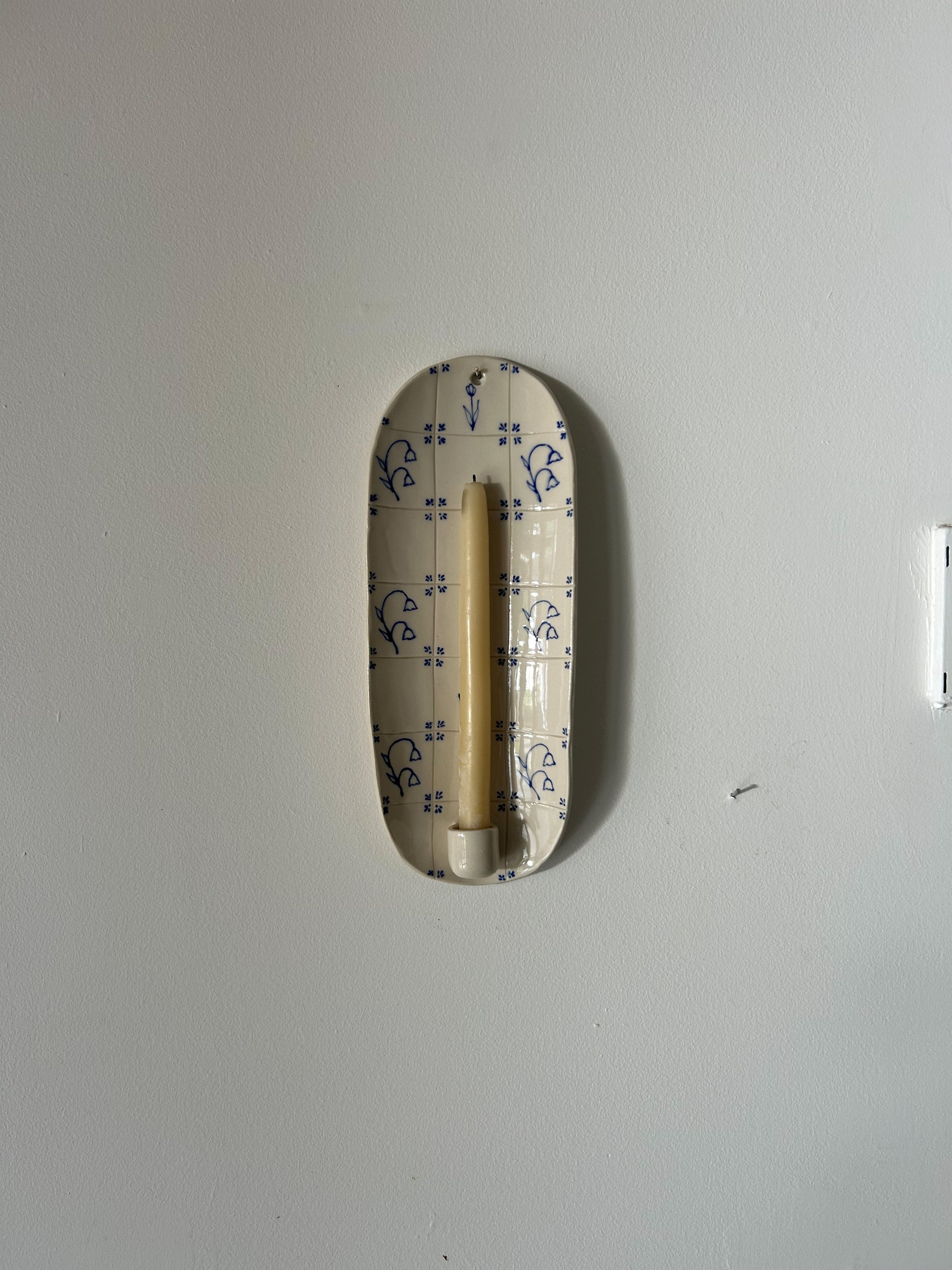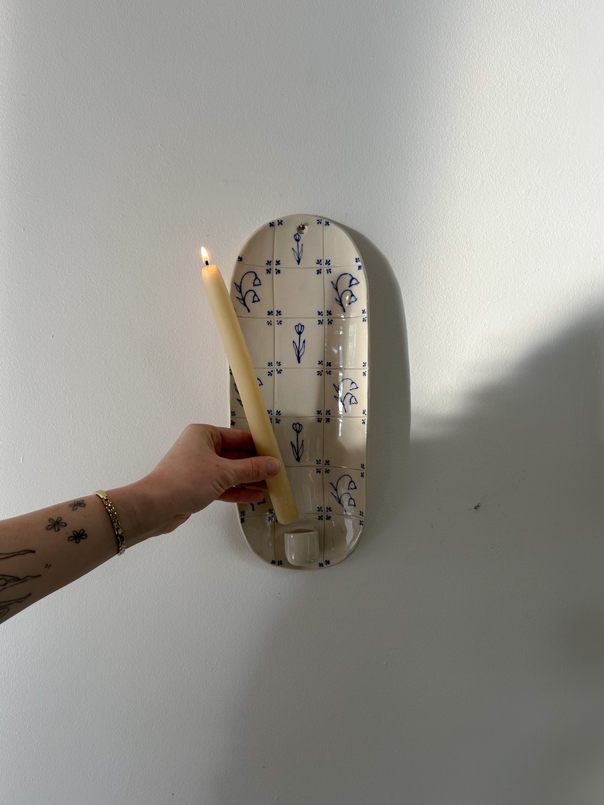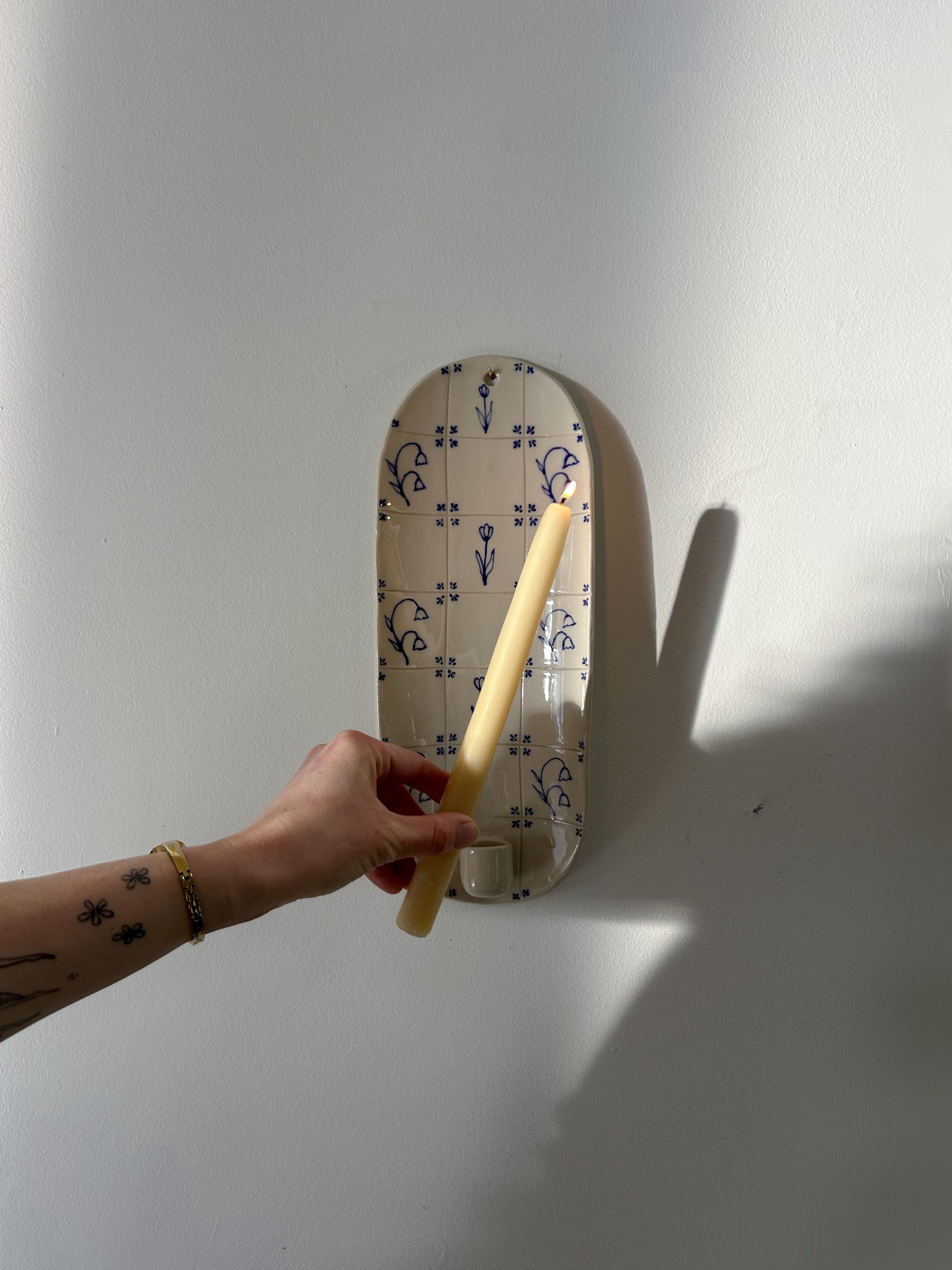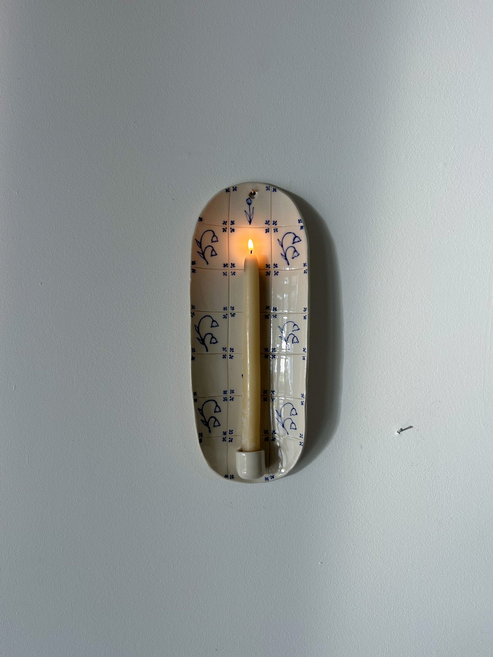 Inspired by vintage delftware this sconce, featuring carved tiles and hand painted blue detailing, is designed to bring a sense of warm ambience and vintage charm to your home