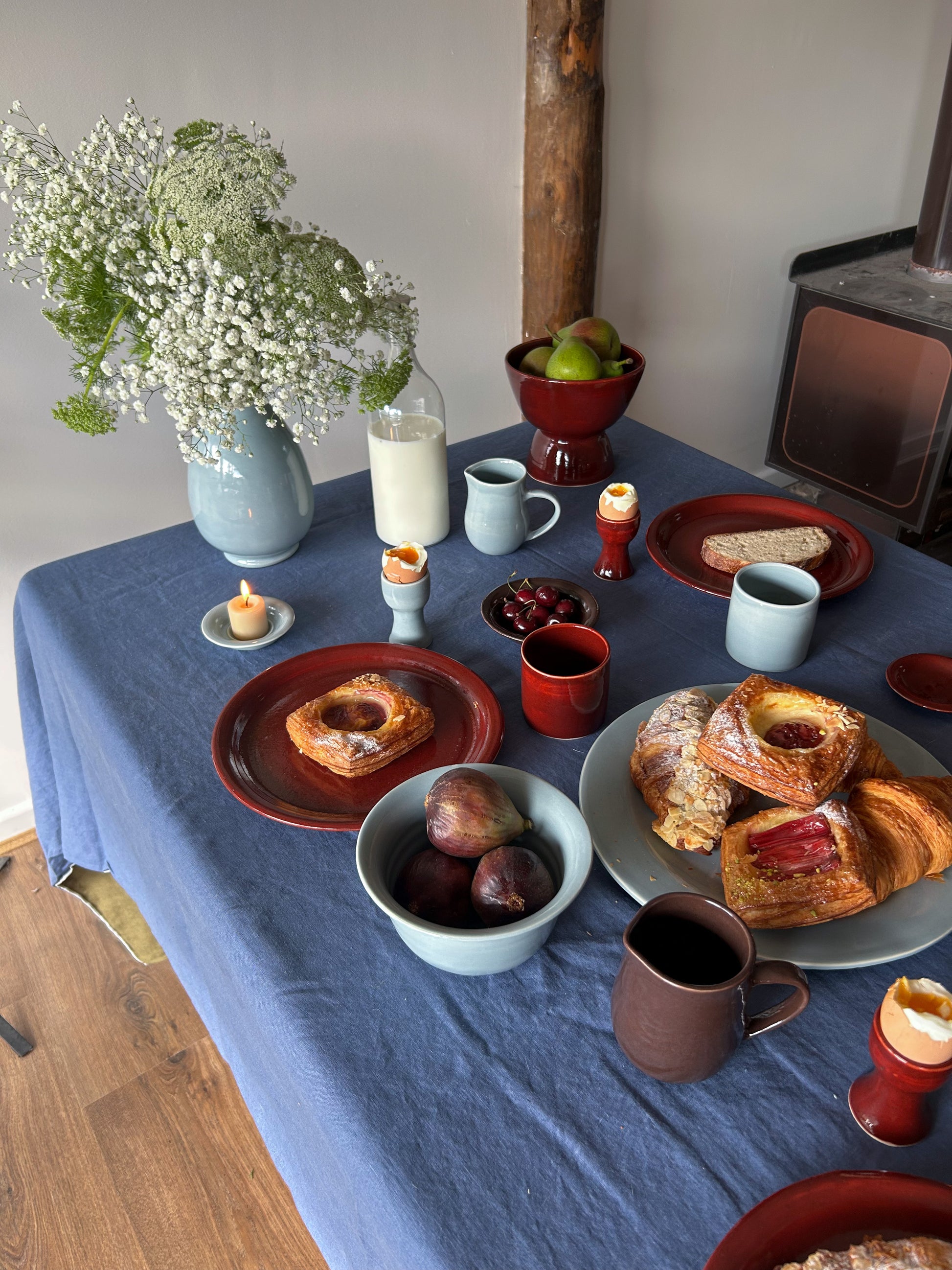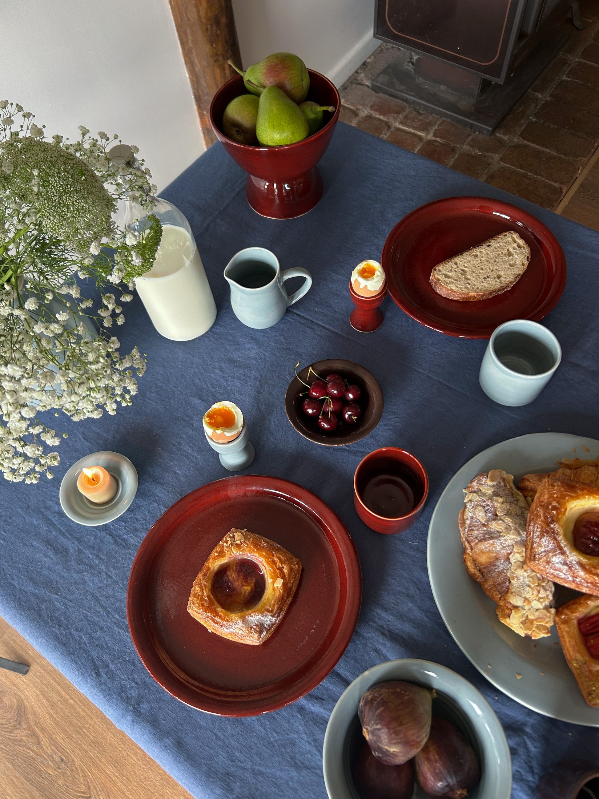 - A white clay body with a glossy cherry red of sky blue glaze finish